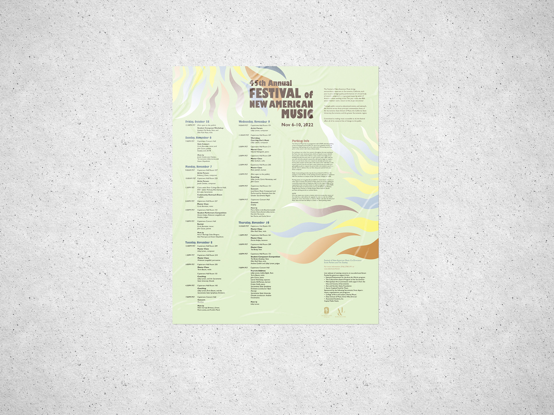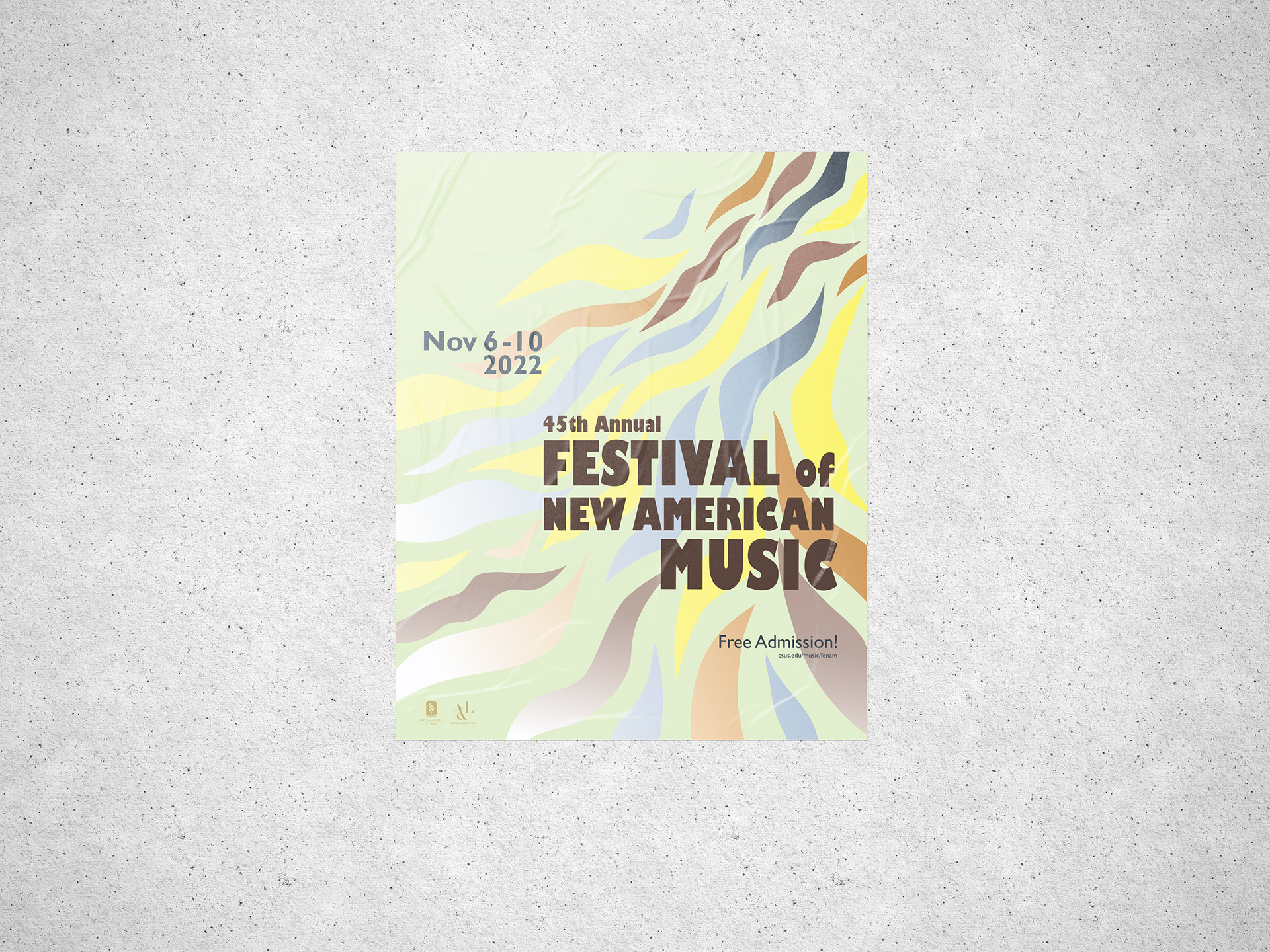 The Festival of New American Music (FENAM) is an annual event held at Sacramento State that brings a diverse group of musicians and performers to present their music. The event consists of public concerts, educational events, and outreach, and serves California State University, Sacramento State School of Music, and the greater Sacramento region. The main goal of my campaign was to communicate the diversity of music presented at the festival and visually represent the feeling of the event. The waves used as a visual element of the campaign represent the flow of music and how it fills the room, helping the listener to dive into another world. The different colors represent the festive and celebratory nature of the event, as well as the diversity of music presented.